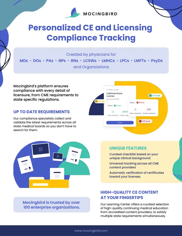 When another licensing service misinterpreted requirements and added unnecessary tasks, Mocingbird stepped in to verify my compliance and clarified the correct rules directly with them. Thanks to Mocingbird, I can focus on my patients and enjoy my free time, knowing I’m compliant without extra work. Mocingbird values my time.”